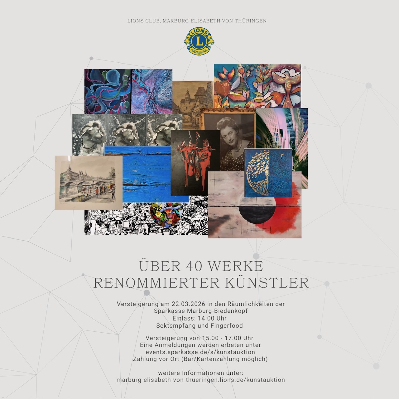 Eine Auswahl der zur Versteigerung stehenden Bilder und Fotografien ist zurzeit in der Hauptstelle der Sparkasse Marburg-Biedenkopf zu sehen, eine sich ständig vermehrende Auswahl kann auch auf der Lions-Website unter marburg-elisabeth-von-thueringen.lions.de/ueber-uns betrachtet werden.