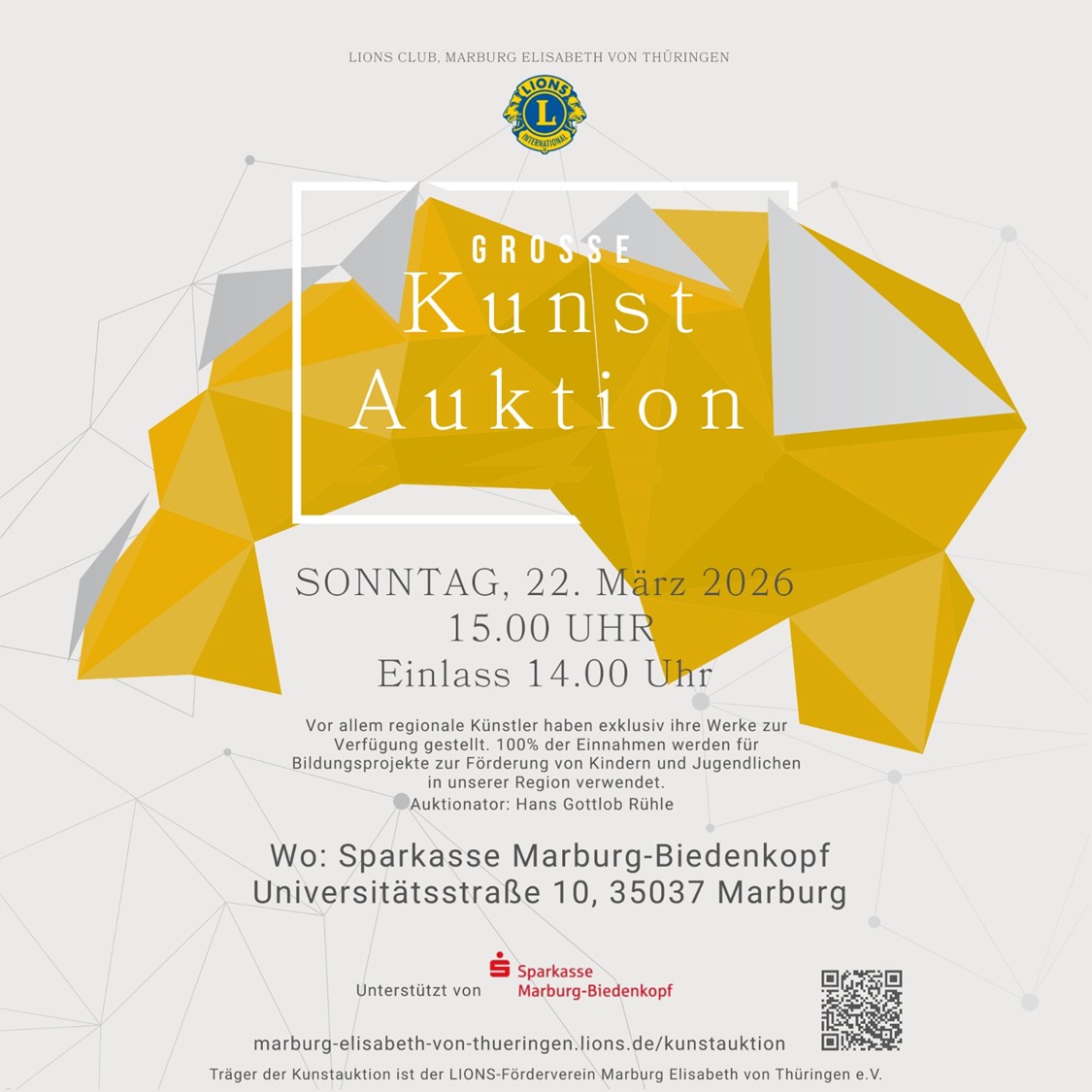 Mehr als 100 Interessierte kamen im Oktober 2024 in die Räume der Sparkasse Marburg-Biedenkopf, um der Versteigerung von über 60 Kunstobjekten beizuwohnen. Letztlich brachte der Auktionator Hans Gottlob Rühle rund 40 Bilder, Fotografien und Skulpturen an Mann oder Frau. Mit dem Erlös von rund 7.000 Euro unterstützte der Lions Club das von seiner damaligen Präsidentin Karin Buder vorgeschlagene Projekt – den Herzenswunsch-Krankenwagen der Malteser.